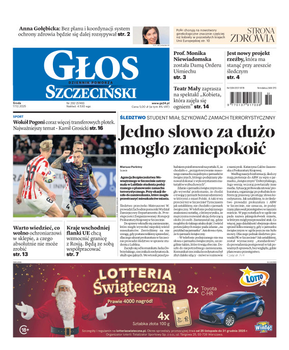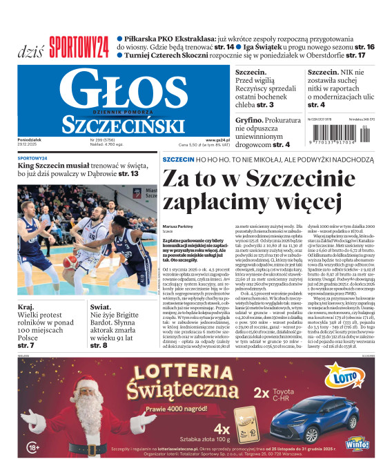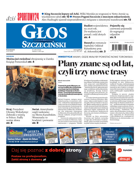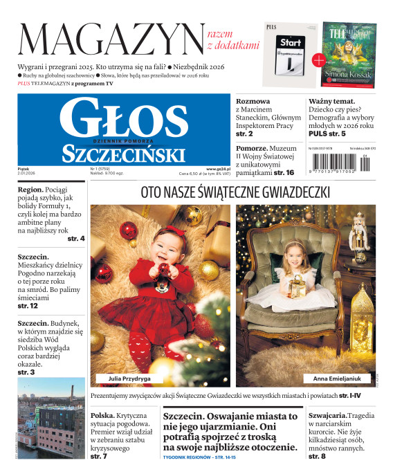 Głos Dziennik Pomorza - Głos Szczeciński to największy regionalny dziennik wydarzeń i opinii ukazujący się na terenie Pomorza Zachodniego i Środkowego. Jesteśmy gazetą lokalną mocno odwołującą się do Czytelnika związanego z jego miejscem zamieszkania. Wspieramy inicjatywy lokalne, uczestniczymy w życiu regionu i jego mieszkańców. Gazeta ukazuje się sześć razy w tygodniu. W poniedziałki oferujemy magazyn Sport24 z informacjami sportowymi z regionu, z kraju i ze świata. Piątek to duży magazyn reporterski wraz z lokalną wkładką tygodnikową i magazynem telewizyjnym. W sobotę gazeta zawiera dodatkowo 16-stronicowy „Magazyn rodzinny” na który składają się teksty i atrakcyjne tematyczne poradniki z zakresu zdrowia, kulinariów, kultury i stylu życia. Kupując wydanie elektroniczne, otrzymują Państwo dostęp do dwóch miesięczników: „Ekstra Magazynu” - w którym publikujemy najciekawsze wywiady z gwiazdami oraz ciekawymi osobistościami, felietony i reportaże spośród materiałów, które ukazały się w danym miesiącu w całej Polsce oraz „Głos ma Historia” - miesięcznik przygotowywany lokalnie przez redaktorów z Pomorza Środkowego i Zachodniego, docierających do najciekawszych materiałów opisujących dzieje naszej ziemi na przestrzeni wieków, które niejednego pasjonata historii potrafią zaskoczyć i zainteresować, a w młodszych czytelnikach zaszczepić ciekawość i przywiązanie do historii własnego regionu.