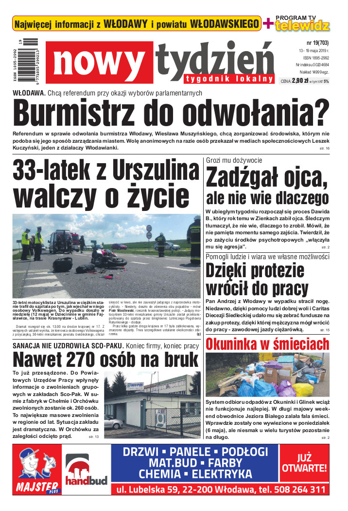 WŁODAWA. CHCĄ REFERENDUM PRZY OKAZJI WYBORÓW PARLAMENTARNYCH BURMISTRZ DO ODWOŁANIA? 33-LATEK Z URSZULINA WALCZY O ŻYCIE ZADŹGAŁ OJCA, ALE NIE WIE DLACZEGO DZIĘKI PROTEZIE WRÓCIŁ DO PRACY OKUNINKA W ŚMIECIACH