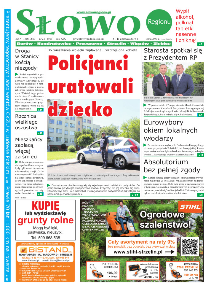 POLICJANCI URATOWALI DZIECKO STAROSTA SPOTKAŁ SIĘ Z PREZYDENTEM RP EUROWYBORY OKIEM LOKALNYCH WŁODARZY ABSOLUTORIUM BEZ PEŁNEJ ZGODY DROGA W STANICY KOŚCIĄ NIEZGODY